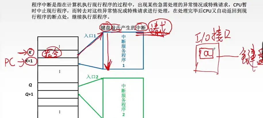 程序中断方式:在等待键盘输入的时候,CPU 同样也会去做其他事情。若是键盘输入了字符后,此时 I/O 接口会向 CPU 发起一个中断请求,此时 CPU 会响应中断请求,此时从 I/O 接口取出数据。