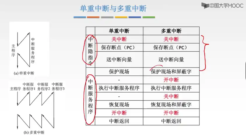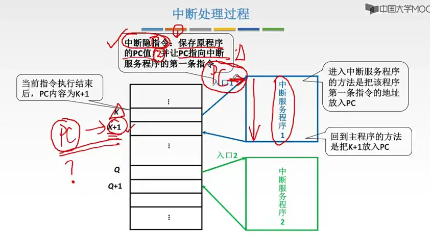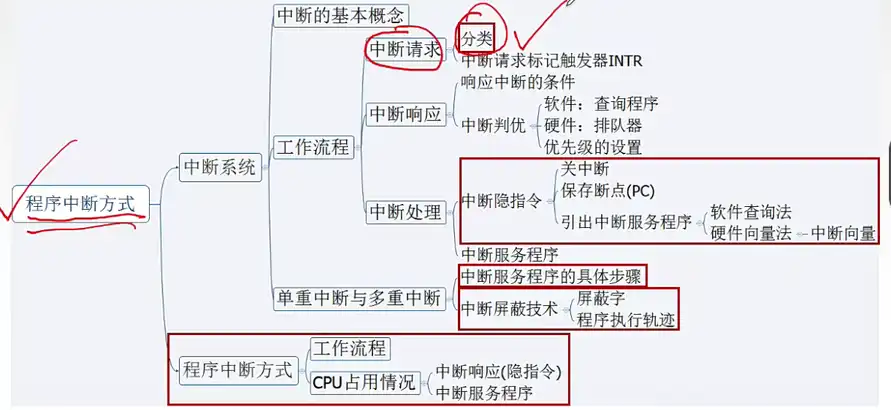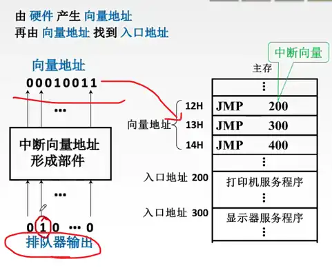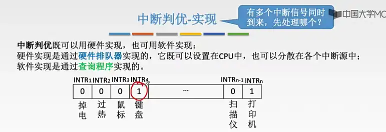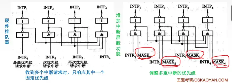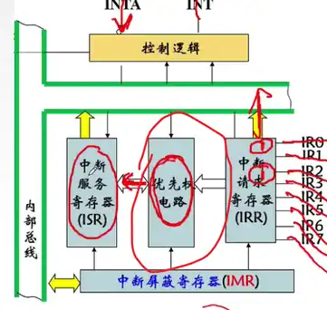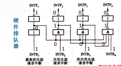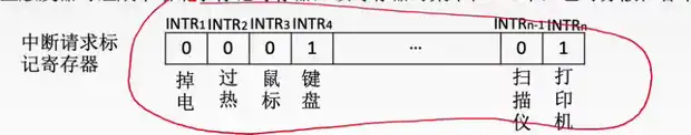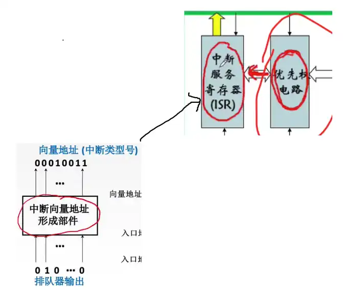 此时通过中断判优,也就是通过这个优先权电路后会确定一个中断信号被选中,画大圆圈如下: