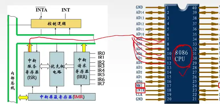 此时无论收到多少个 IO 请求信号,这个中断服务程序都会通过内部总线来给 CPU 发送一个中断请求信号,如下控制逻辑位置的那根线到NMI则是输入信号的过程: