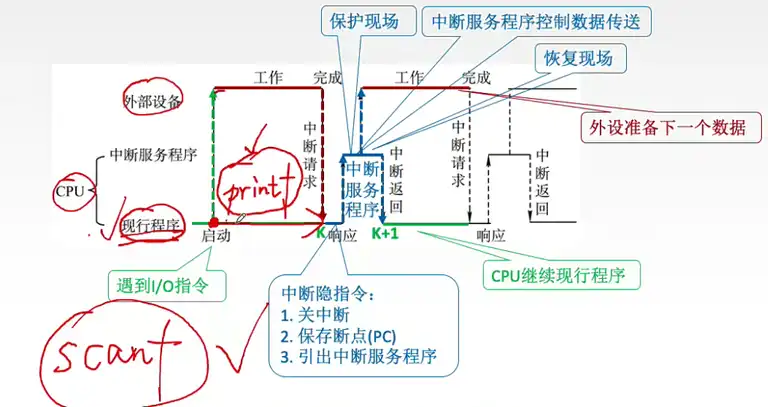 如上图,我们来叙述下 CPU 要将一些数据交由外设打印的整个程序中断的流程