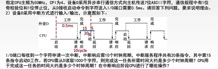 首先来计算下外设 D 传输到 I/O 端口所耗费的时钟周期数,0.5ms/20ns=25000 个时钟周期,接着根据题意中断响应需要 10 个时钟周期,对于中断服务程序总共有 20 条指令,由于其中第 15 条指令是用来启动,那么我们只需要计算这 15 条指令所耗费的时间,这里 CPI 为 4, 表示的是一条指令需要 4 个时钟周期。