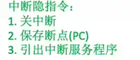 首先执行中断隐指令,在执行隐指令的过程中,实际上也会去执行中断服务程序,在中断服务程序中会首先保存现场接着执行中断程序,最后恢复现场结束。