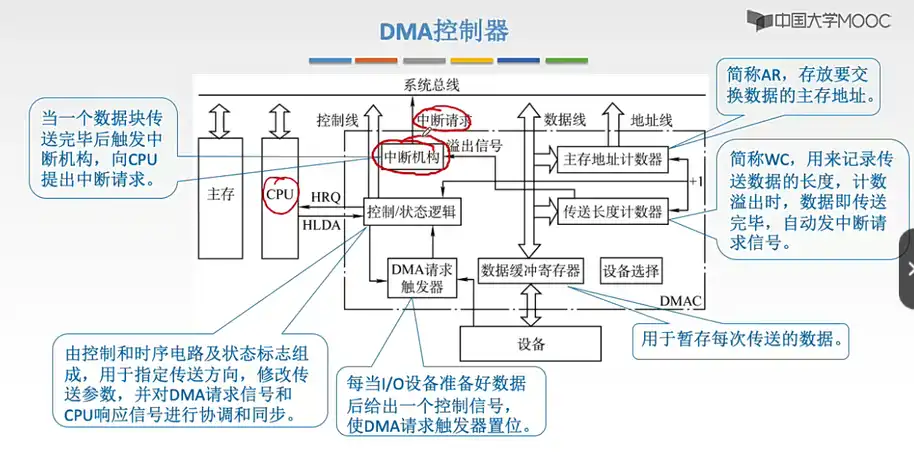 中断机构:当 DMA 完成了整一块的数据传输之后,此时就会发送一个中断请求信号,其就是由中断机构发出的。