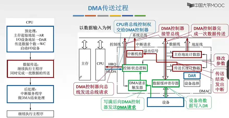 • 若是主存是双端口的,那么是可以支持 DMA 与 CPU 同时访问的,若是不是双端口,那么同一时间只能有一个设备能够访问。