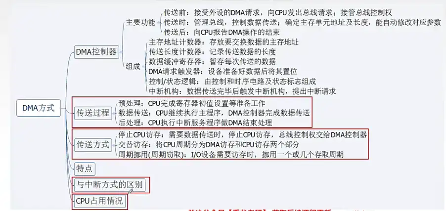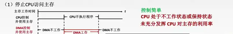 疑问:在这里系统总线是由 CPU 来进行管理的,当 DMA 控制器在不断占用系统总线时,CPU 决定是否要将控制权交给 DMA 控制器,对于当前 DMA 控制器占用着,CPU 是否能够访问主存?