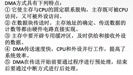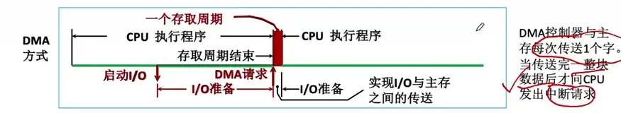 • 对于 DMA 中一个存取周期时间一定会比程序中断方式中的时间更短,因为在程序中断方式中每传一个字 CPU 要运行一次中断程序,对于 DMA 一个字则是一个存取周期。