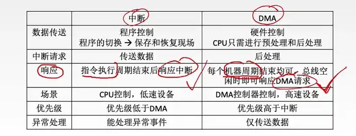• CPU 何时响应:中断方式中指令执行周期结束 CPU 就会进行检查是否有无中断若是有此时就会响应中断;DMA 方式则是每个机器周期结束,一旦总线空闲时 CPU 即可响应 DMA 请求。