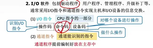 I/O软件:通过采用 I/O 指令和通道指令 实现主机和 I/O 设备的信息交换。