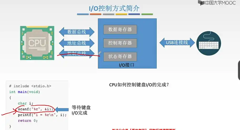 上面的程序代码执行到 scanf 的时候,黑框会卡在当前界面等待输入,此时就表示 CPU 在进行等待输入,对于 CPU 如何来控制键盘的 I/O 操作完成呢?
