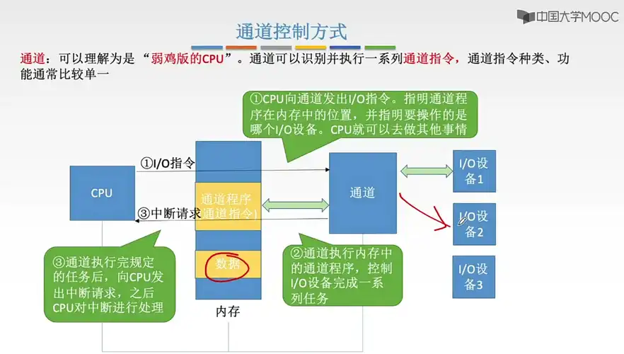 1、CPU 向通道发起 I/O 指令,告知通道程序在内存中的位置,并且指明要控制的 I/O 设备。