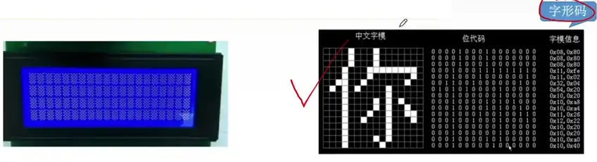 ①字符显示器原理(非阴极射线管原理,一定要注意):通过点阵形式来最终控制位置显示来实现字符的效果,包含中文