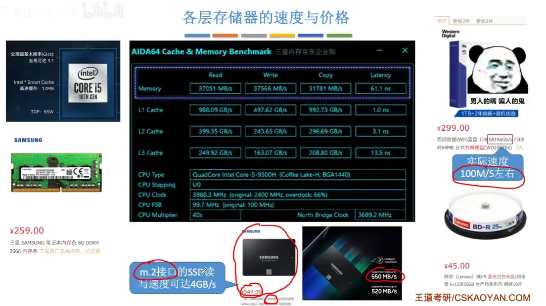 各层存储器的速度与价格:光盘 机械硬盘 固态硬盘 内存条
