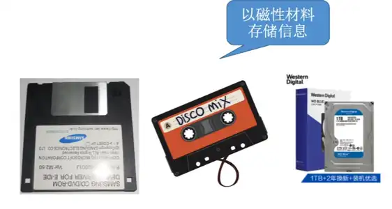 ②磁表面存储器:软盘、磁带、机械硬盘(下图从左到右)