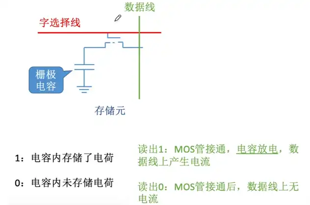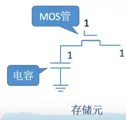 • 写入二进制原理:可以在 MOS 管的右端加一个 5v 的高电平,同时也给 MOS 管加一个 5v 的电平,此时 MOS 管就可以接通,电容中就会存储 1,此时 MOS 管端口,电容里的电荷就跑不出去了。
