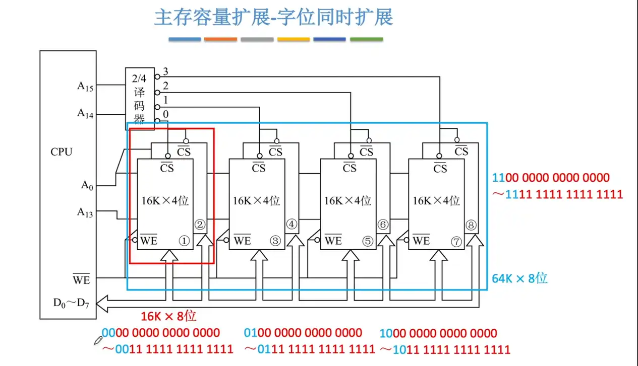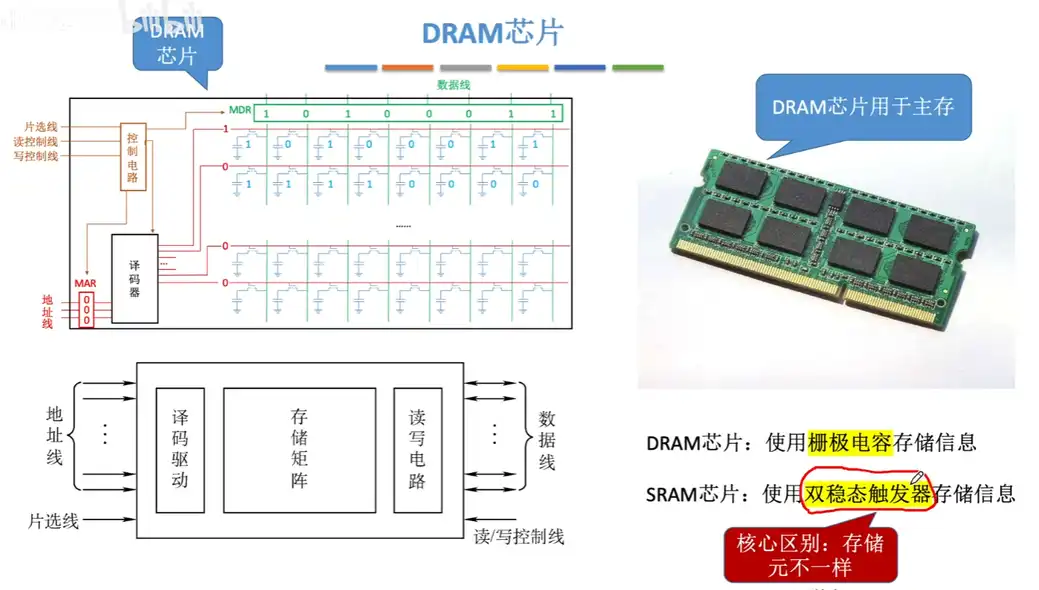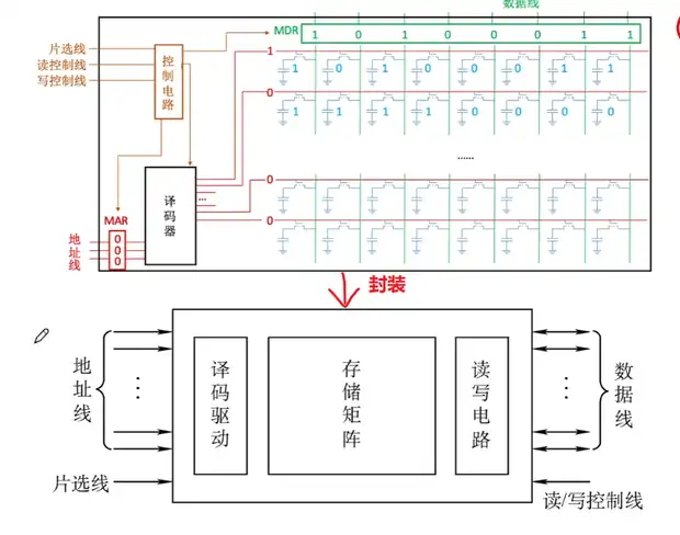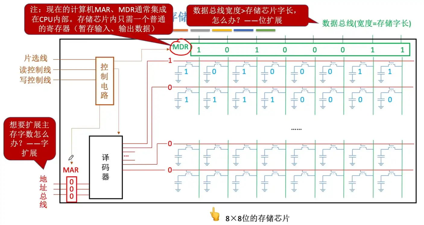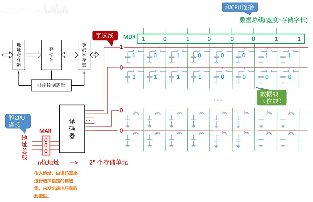 • 一个地址信号可以被转换成译码器的某一条输出线的高电平信号,一旦这一条字选线被接通之后,我们就可以通过数据线,把每一个的二进制数据传送到 MDR 当中。此时 CPU 会通过数据总线从 MDR 中取走一整个数据。