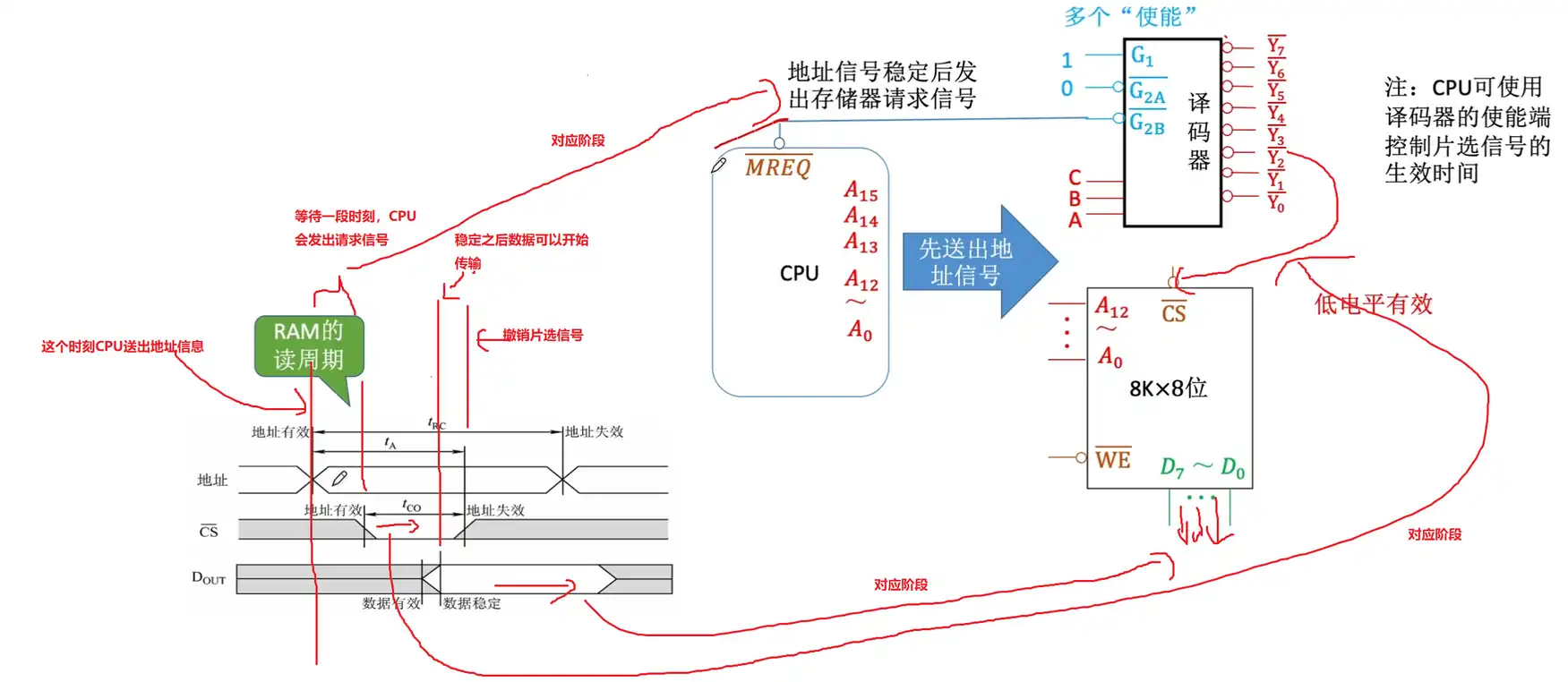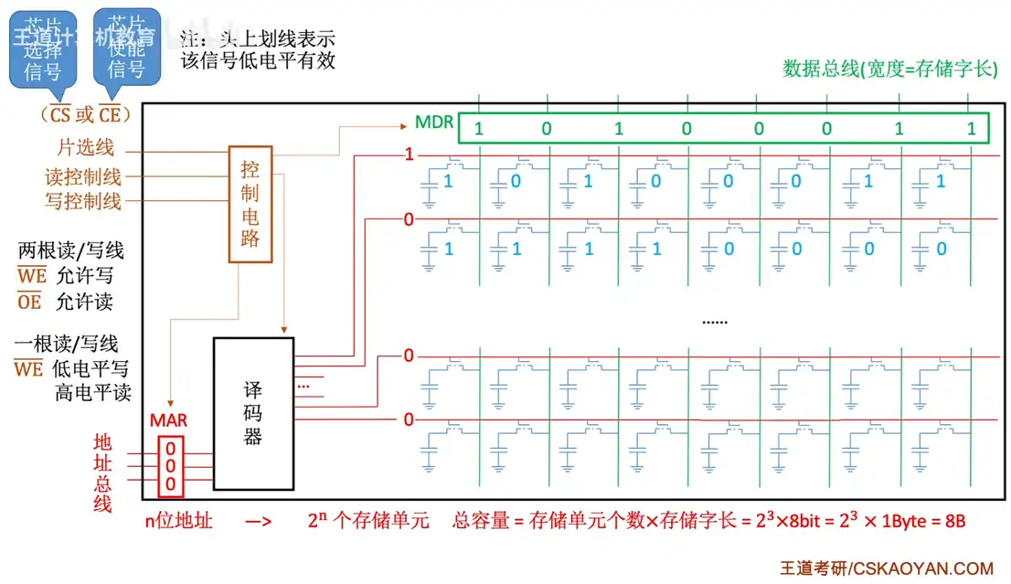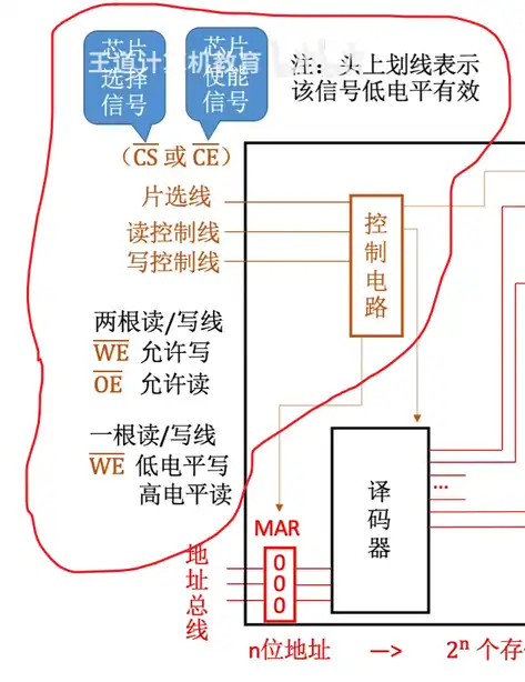控制电路作用:①对于传输数据到 MAR 当中时可能并不稳定,所以控制电路做的一个工作就是,只有当 MAR 当中的数据稳定之后才会去打开译码器开关来进行读取并翻译地址来给出信号。②于此同时传输到 MDR 的数据也要稳定了之后才能够传输给数据总线,这也是由控制电路控制的。