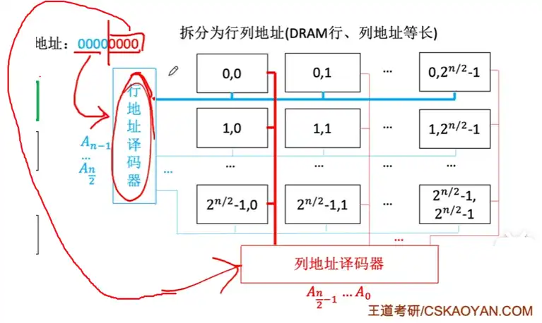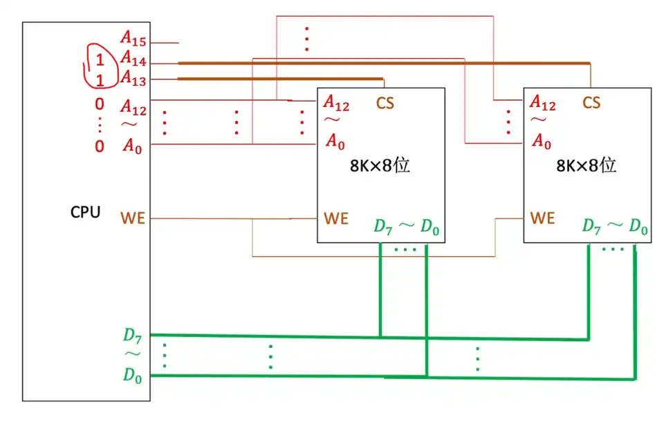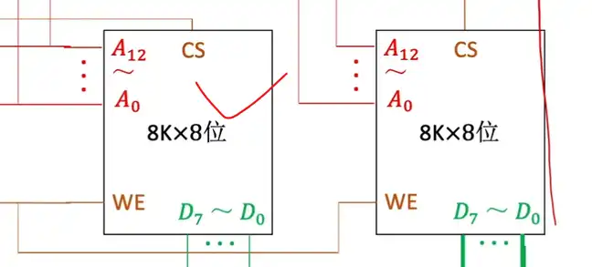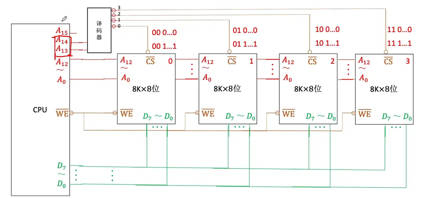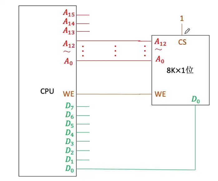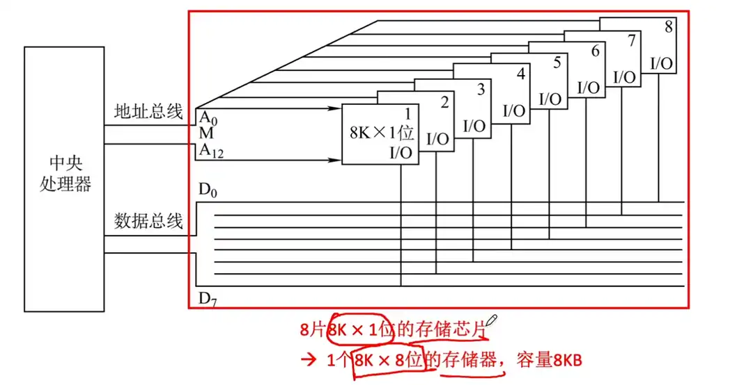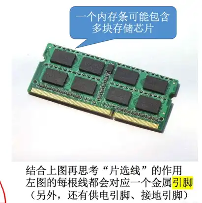 • 一个内存条可能包含多块存储芯片,而有时候我们若是指定要读取某块芯片数据,那么我们可以针对那一块芯片数据传输低电压,其他存储芯片传输高电压,此时就能够单独对指定的存储芯片进行读取了。
