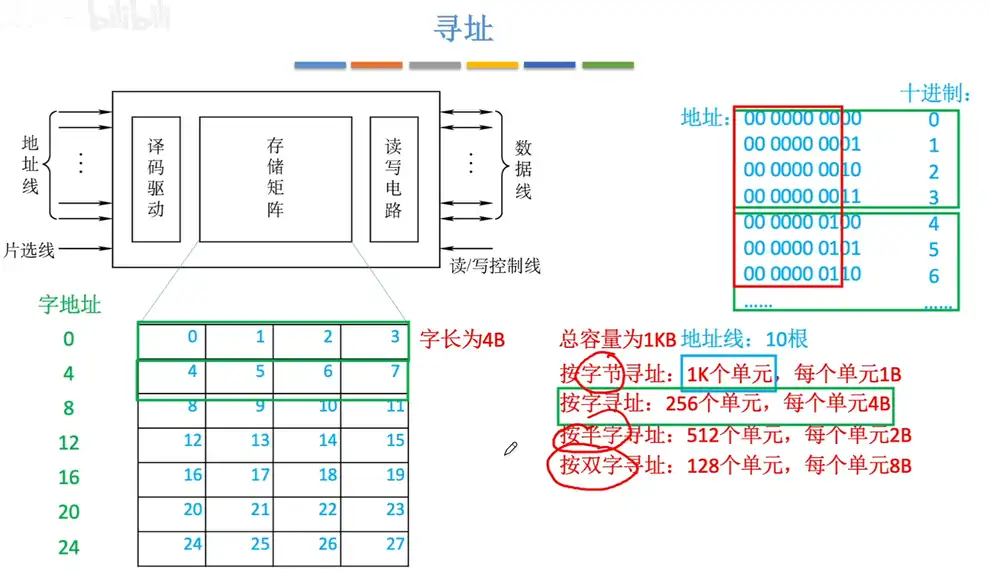 关于寻址的问题主要来看存储器中的存储矩阵,数据是存储在这里:寻址方式可按照字节、字、半字、双字来进行寻址,不同寻址对应的编号也不同,若是更大是倍数,存储单元个数可进行右移