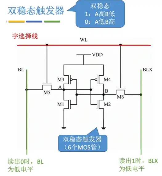 其中双稳态触发器有 6 个,在这种存储器中可以呈现出两种稳定的状态: