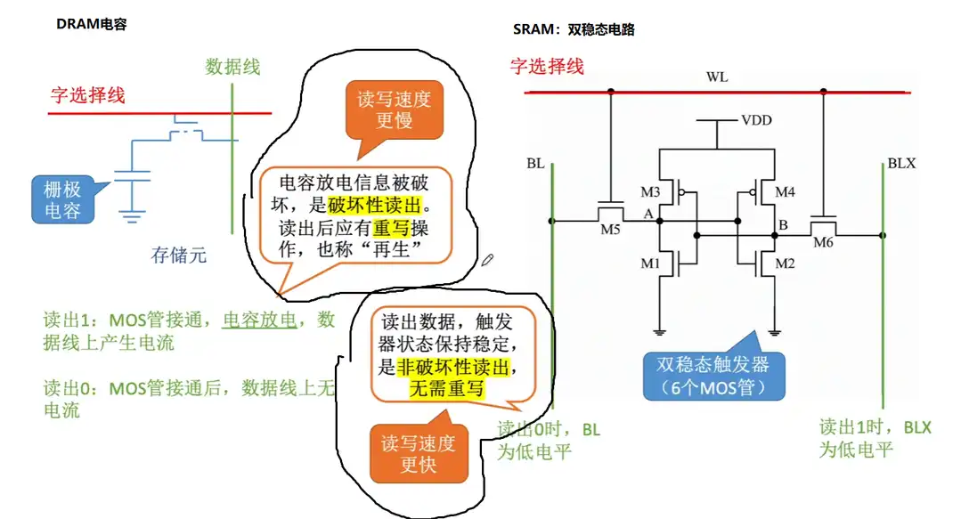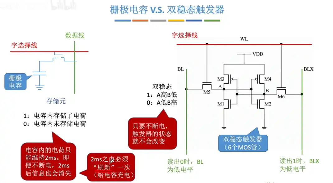 对于左边电容存储元读出数据的数据线只有一根,右边双稳态触发器则需要两根来读取数据,我们可以根据 BL 或者 BLX 读出的是 0 或 1 就能够确定读出的是什么信号了。