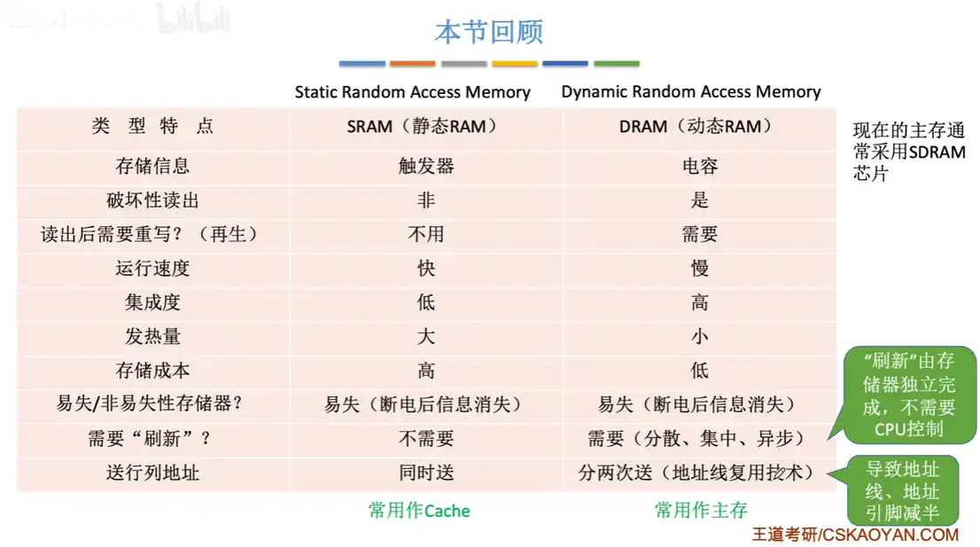 一方面:存储元件上导致的区别,也就是读数据是否需要重写的情况,DRAM 在读数据后需要有一个重写操作,而 SRAM 无需重写。