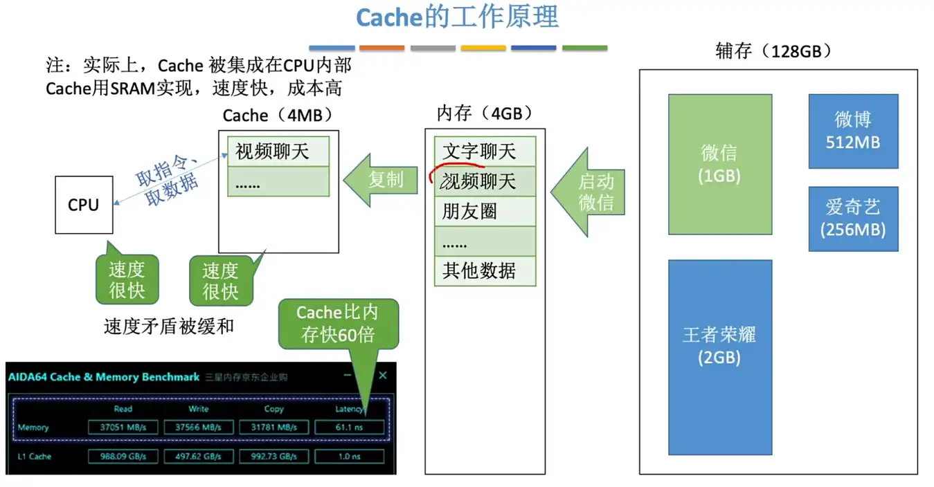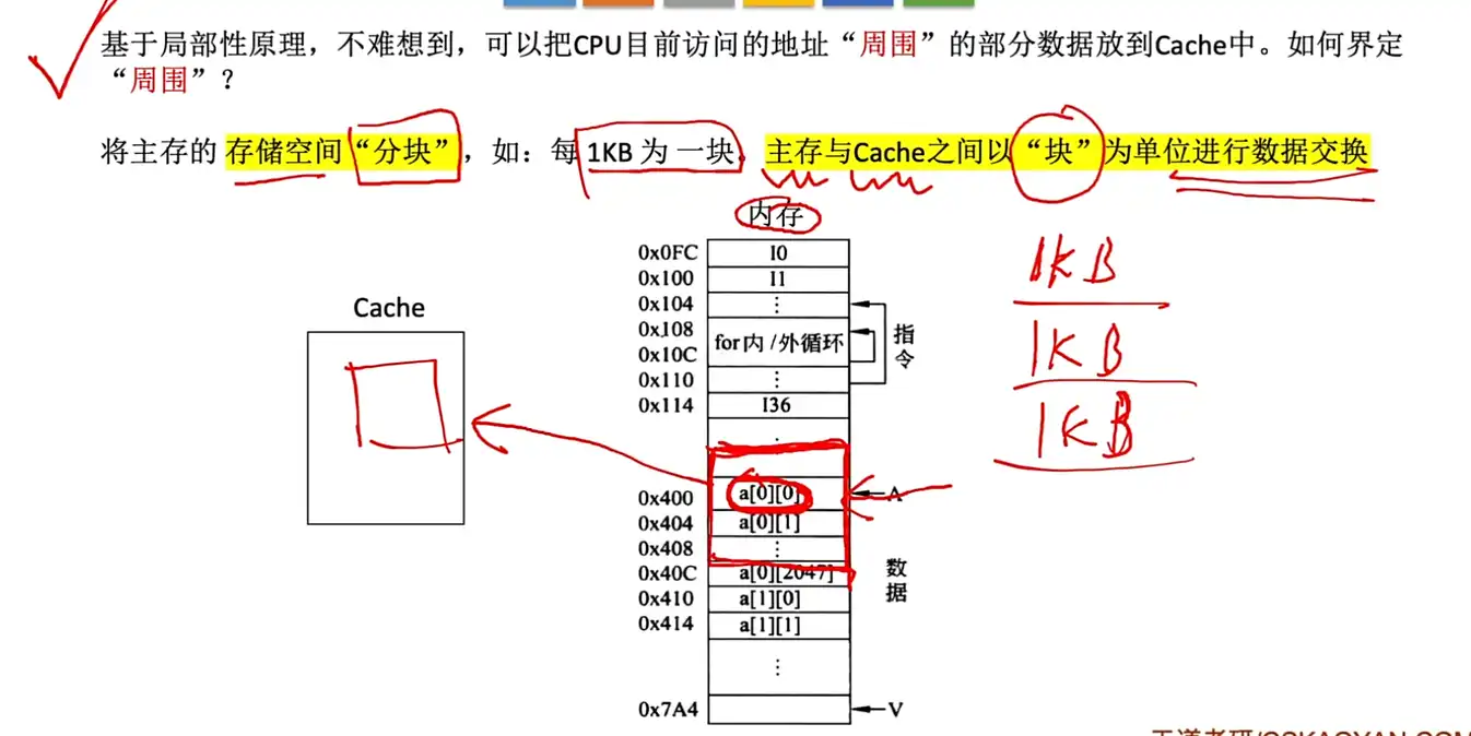 • Cache 与主存之间的数据交换是硬件自动完成的,软件程序员无需关心之间的数据交换,这部分是由硬件工程师实现的。