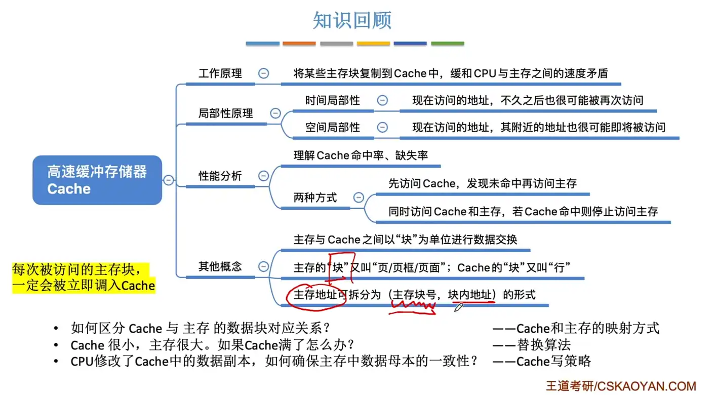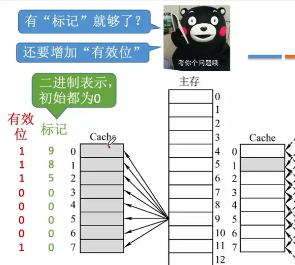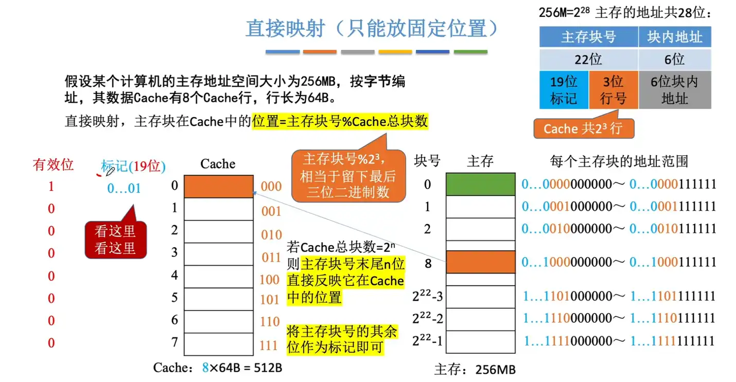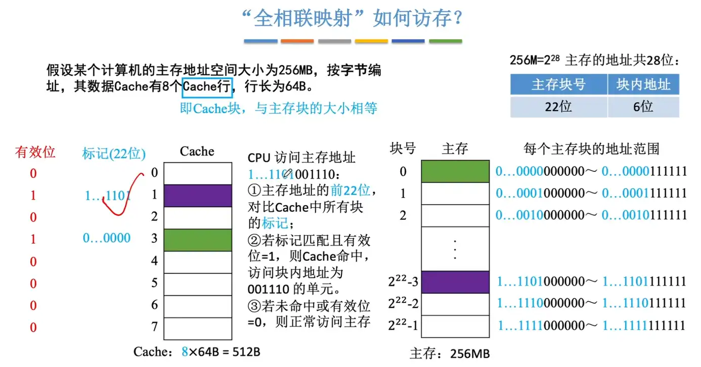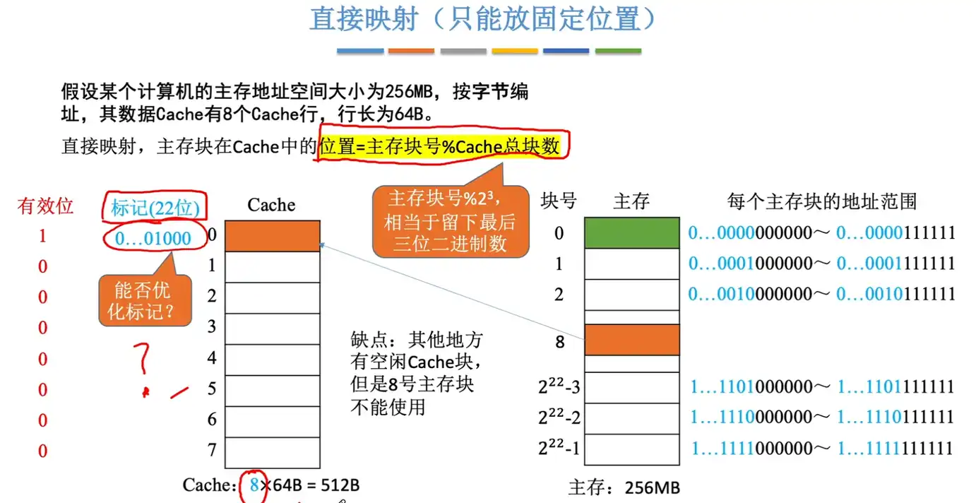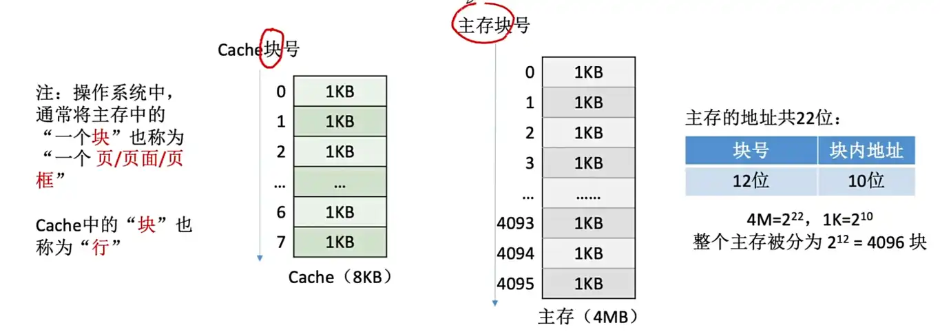 快表:存放在高速缓冲存储器中,同样包含标记、主存块号两个部分,一开始快表是空的