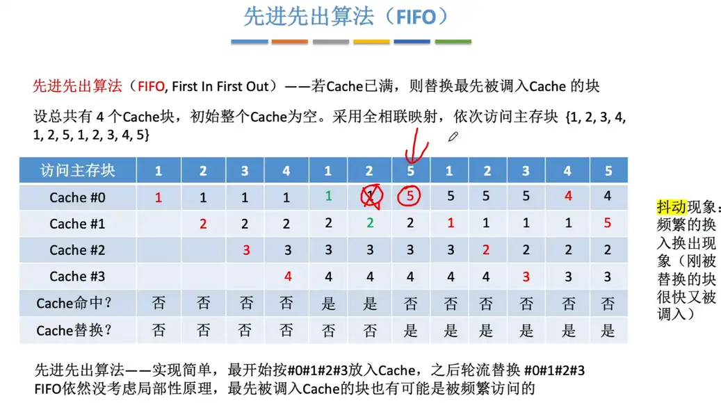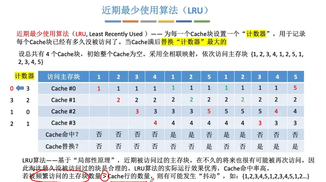 发生抖动情况:若被频繁访问的主存块数量 > Cache 行的数量,则会发生抖动。