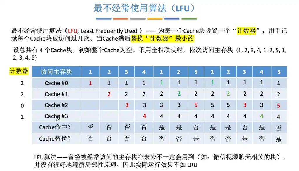 问题:曾经被经常访问的主存块在未来不一定用得到(例如:微信视频聊天相关的块),并没有遵循局部性原理,实际运用效果不如 LRU。