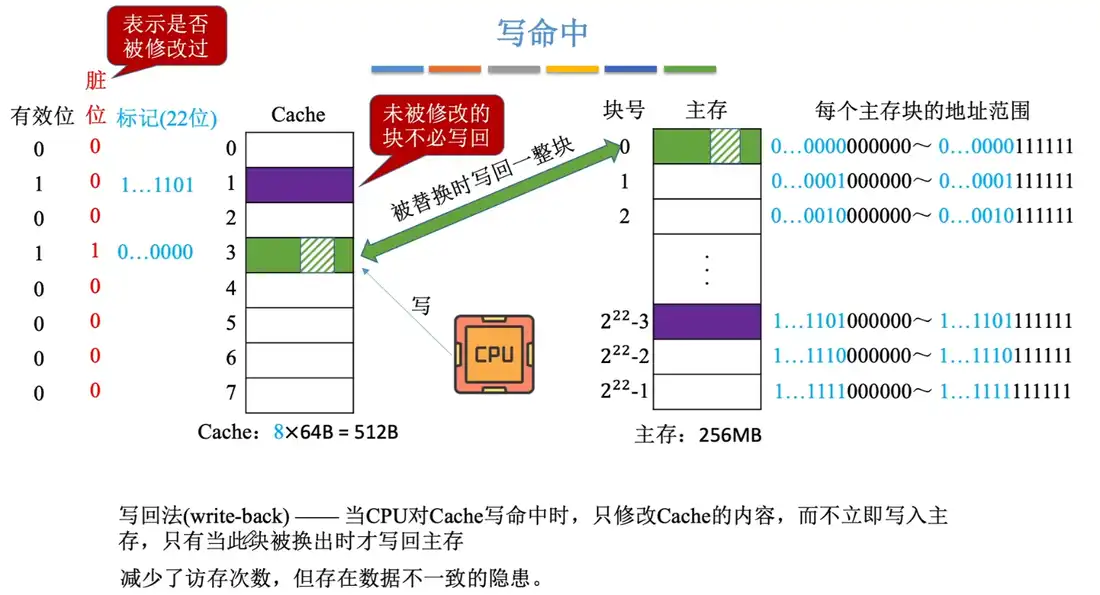 写回法:当 CPU 对 Cache 写命中时,只修改 Cache 中的内容,而不立即写入主存,只有当此块被换出时才写回主存。