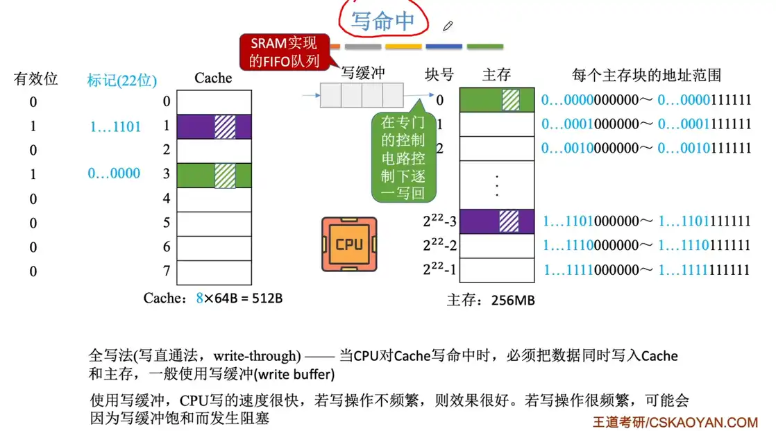 • 由于写缓冲是由 SRAM 实现,CPU 直接写入到 SRAM 中比写入到主存中快得多。