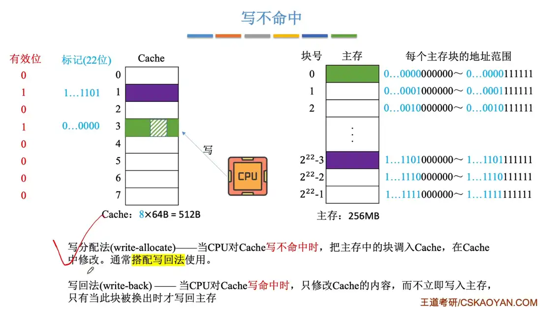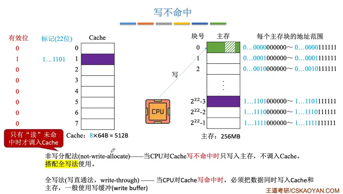 非写分配法:当 CPU 对 Cache 写不命中时只写入主存,不调入 Cache,搭配全写法。