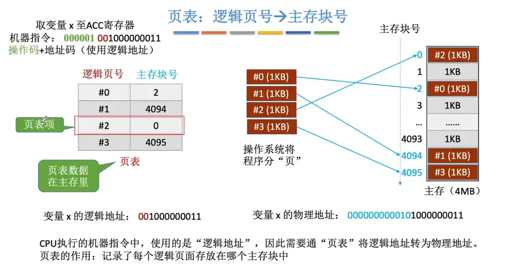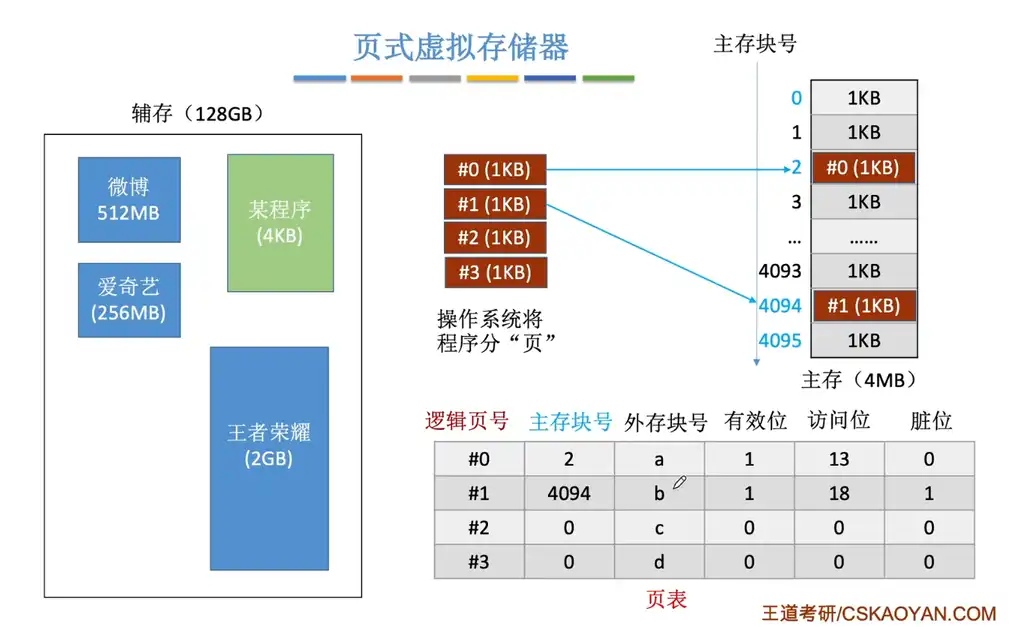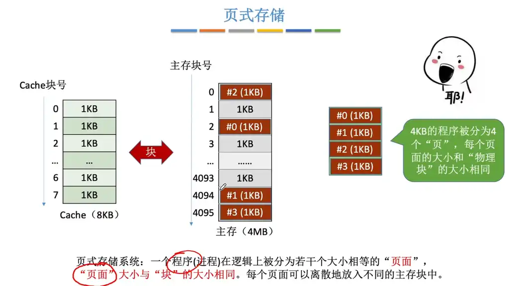 页式存储:一个程序 (进程) 在逻辑上被分为若干个大小相等的 “页面”,页的大小实际上是与我们主存块的大小是相同的,我们可以将一个 4KB 的程序分为 4 个页,可以将 4 个页离散的放入到主存中各个不同的位置。