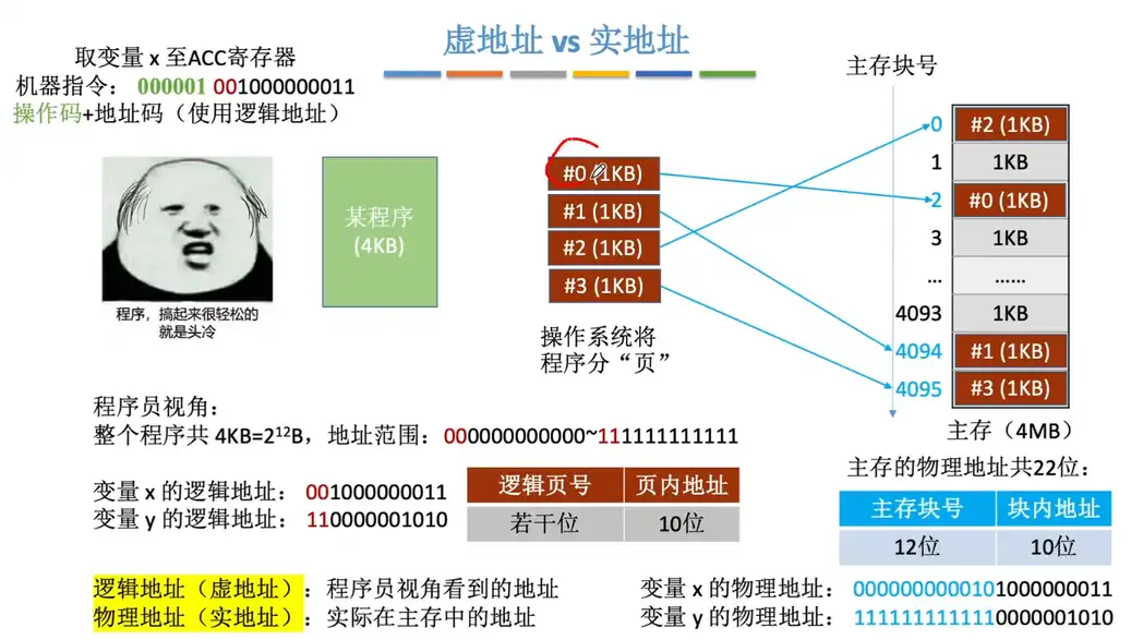 若是一个程序被拆分为多块后离散存储到主存中,如何执行?引入逻辑地址、物理地址概念。