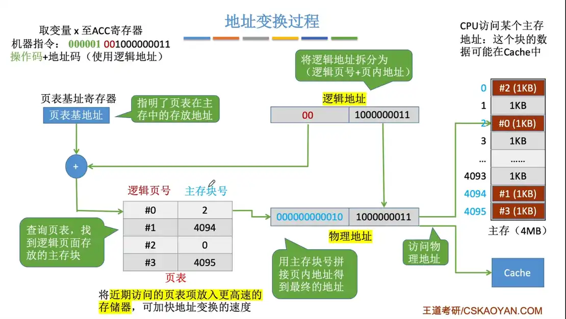 页表:数据存储在主存当中,CPU 在进行地址转换的时候需要去查询页表,意味着 CPU 需要进行一次访存操作。页表中的一行表示为页表项,一个页表项对应着逻辑页号以及主存块号。