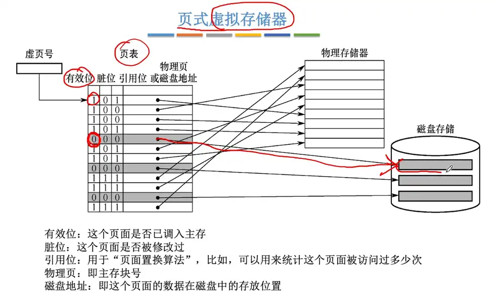 • 有效位:表示对应的数据是否被调入主存,若是已经调入了则为 1,并且物理页或磁盘地址指向了主存。