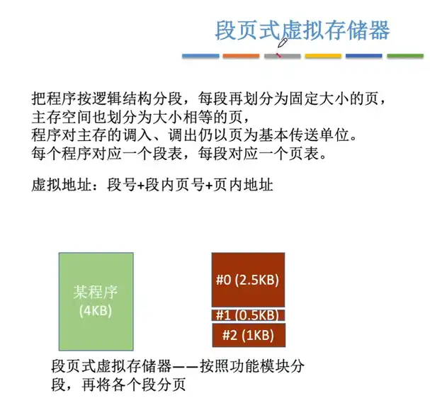 段页式虚拟存储器:先将一个程序分段,再进行分页。也就是首先按照功能模块分段,接着将每个容量不相同的段进行分页(每页容量一致)。