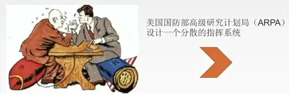 美苏冷战时期,美国国防部有一个单一,十分集中的点,这个中心是否被害怕被核武器给摧毁,一旦中心被摧毁,那么全国的局势系统就会瘫痪,因为所有的节点都依附在这一个只会中心上,此时就想着是不是能够设计一个比较分散的指挥系统?