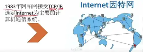 对于阿帕网,在 1983 年正式也接收了这个协议,再此之前使用的是一个旧的协议。同时选择了 internet 为主要的计算机通信系统,最终得到了常说的因特网 Internet