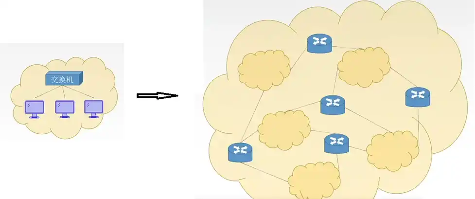 对于节点它们之间连接的链路,那么构成了一朵云彩就叫做网络,将网络和网络通过路由器连接起来,就构成了一个大型的网络,也就是互联网。