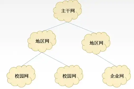 这样的网络是由三层结构构成,最底层就是校园网或者企业网,对于最底层用户若是想要连接到互联网,就需要连接到第二层的地区网,并且第二层地区网再去连接到第一层的主干网,此时就形成了逻辑比较清晰的三层网络结构