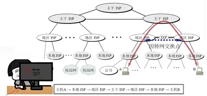 • 只要每一个本地 ISP 都安装路由器连接到地区 ISP,接着地区 ISP 也有路由器连接到主干 ISP,那么就可以完成因特网当中所有的数据分组转发的任务,此时我们就能够畅游网络,访问各个网站的资源。