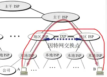 原本 a 与 b 通信需要经历一层又一层的 ISP 结构,通过本地 ISP 到地区 ISP 再到主干 ISP,此时若是有了 IXP 之后,那么我们可以直接允许这两个网络相连接,此时就不需要第三个网络转发分组了。