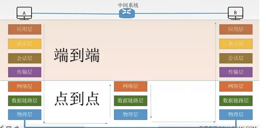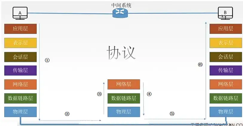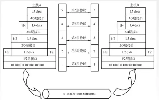 主机 A 发送过程:①首先数据进入到应用层,此时会加上相应的 PCI 协议组成报文。②进入到传输层时,会将报文切成一个个报文段并且再次加上传输层的控制信息。③进入到网络层会将报文段封装为数据报。④进入到数据链路层则是要进行成帧。⑤直接将帧转为比特流形式发送出去。