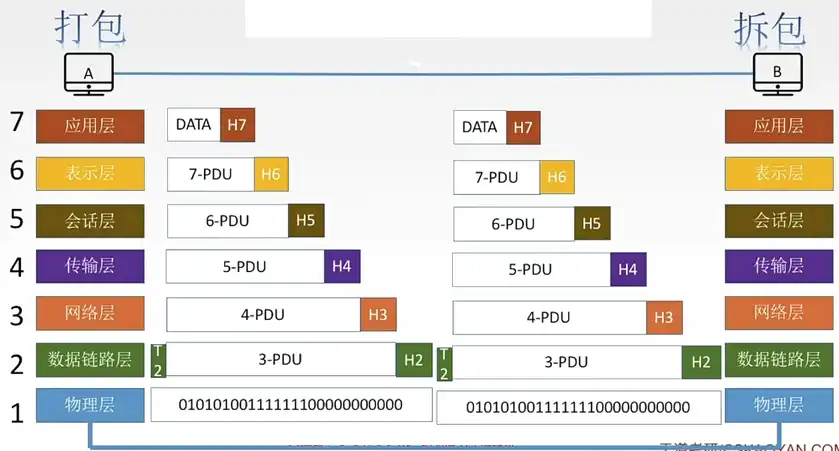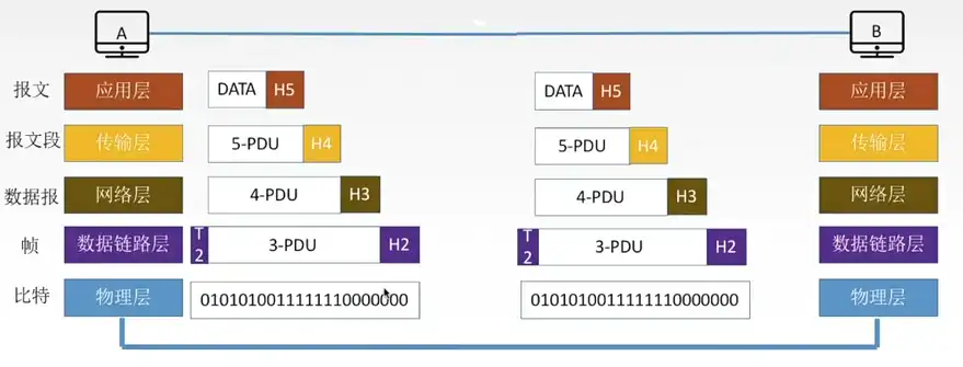 主机 B 接收过程:首先时物理层接收到比特流,接着到每一层依次来进行还原,最终得到主机 A 发送的数据。