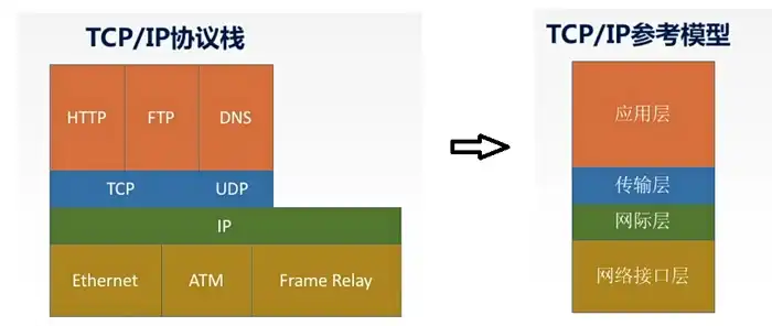 首先是诞生于 TCP/IP 的协议栈,接着根据这个协议来进行一个分层,分分层出这样的一个参考模型