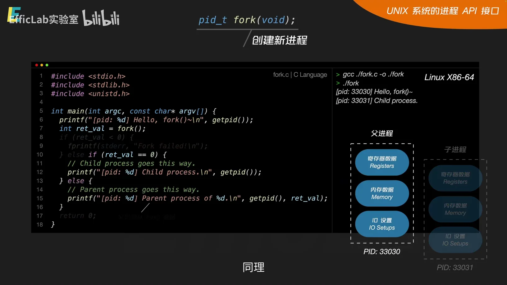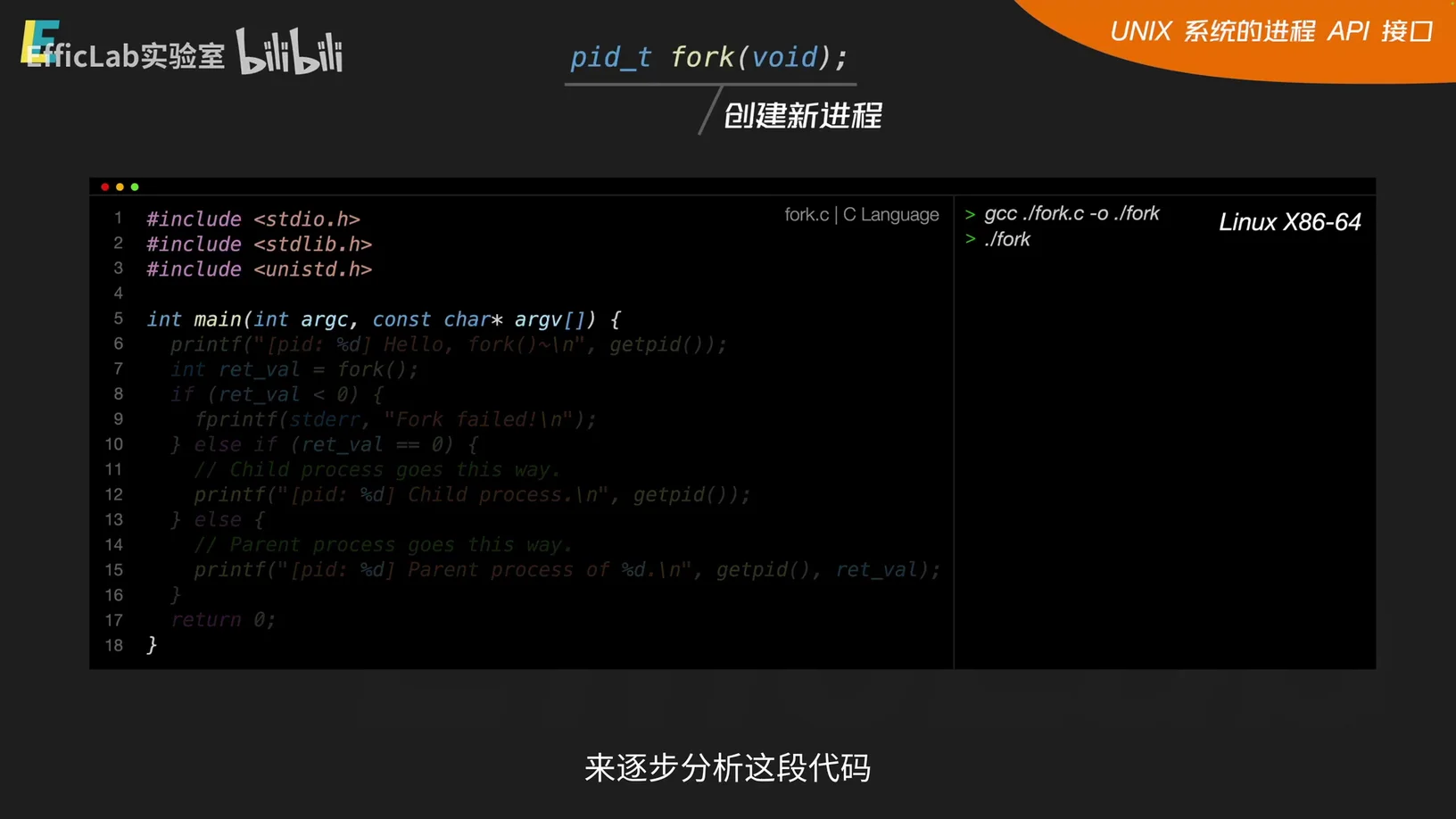 通过代码分析,解释了fork接口如何在操作系统中创建新进程,新进程与原进程共享相同的代码段和执行位置,以及如何通过return value区分子进程和负进程,进而获取进程标识符进行输出。