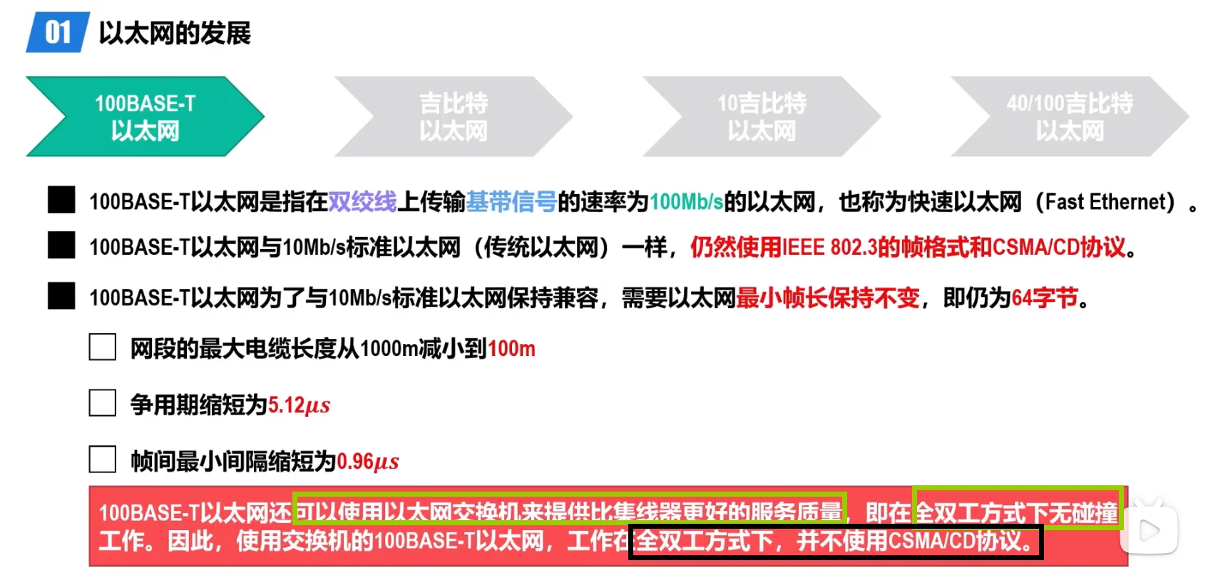 100BASE-T以太网与10Mb/s标准以太网(传统以太网)一样,仍然使用IEEE802.3的帧格式和CSMA/CD协议。