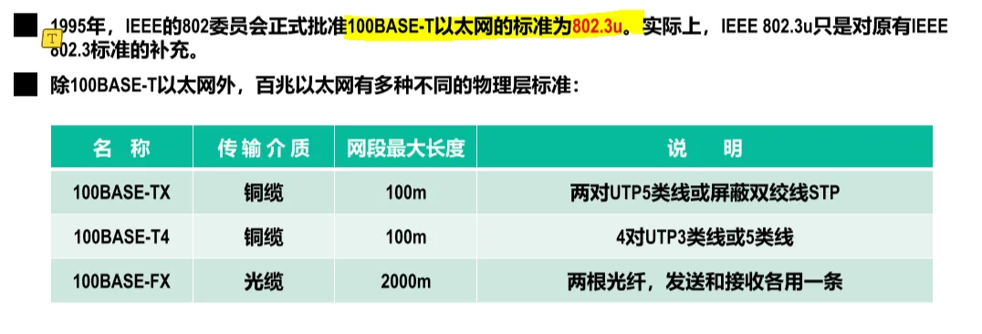 100BASE-T以太网是指在双绞线上传输基带信号的速率为100Mb/s的以太网,也称为快速以太网(Fast Ethernet)。