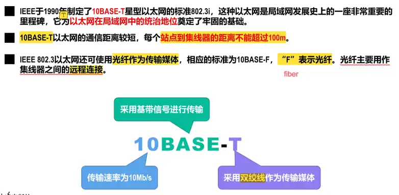 IEEE 802.3以太网还可使用光纤作为传输媒体,相应的标准为10BASE-F,“F”表示光纤。光纤主要用作集线器之间的远程连接。